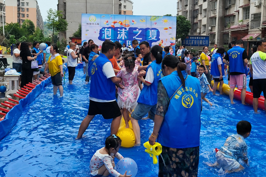 5月30日下午,一場由物業(yè)公司和幼兒園,精心組織、策劃的“慶六一泡沫之夏水上狂歡暨防溺水安全知識宣傳”活動,在桃園北區(qū)籃球場拉開帷幕。一座臨時搭建的“水上樂園”成了孩子們的快樂主場。孩子們首先表演了精彩的文娛節(jié)目,隨后的水上狂歡,將氣氛推上了高潮?;顒蝇F(xiàn)場,水花四濺,笑聲飛揚!水槍對戰(zhàn)、皮劃艇競速、水彈投擲、獨木橋竟走……等游戲,趣味性強,同時,在考驗孩子們體力的同時,也培養(yǎng)和鍛煉他們的團隊協(xié)作能力。家長們也忍不住加入“戰(zhàn)斗”,炎炎夏日瞬間清涼十足!
